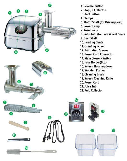 Même extracteur à jus que le Angel Juicer 5500 mais avec la fonction de marche arrière automatique. Lorsque vous extrayez le jus de fruits plus mous et de l'herbe de blé, il est facile de surcharger l'extracteur à jus mais avec le Angel Juicer 7500, il ressent la pression supplémentaire tout de suite et se met en marche arrière automatiquement pour éviter les blocages. Cela évite d'avoir un excès de pression à l'intérieur de l'appareil, ce qui pourrait endommager le tamis.